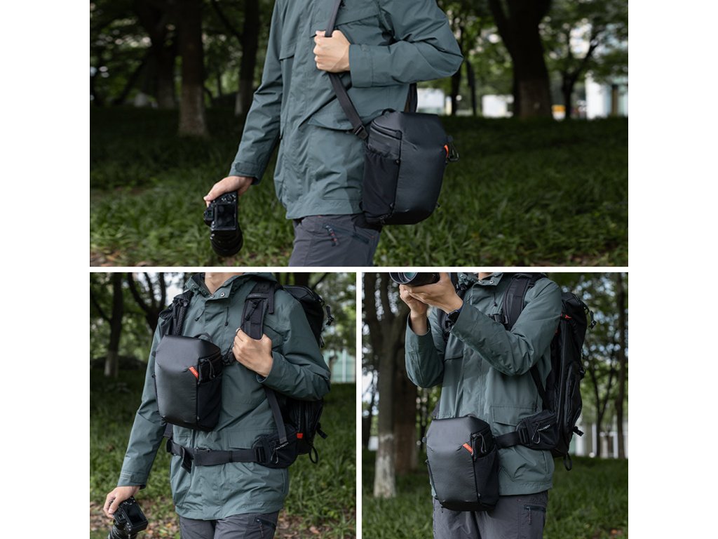 Pohodlné nosenie – odnímateľný ramenný popruh, možnosť uchytenia na batoh alebo bedrový pás.