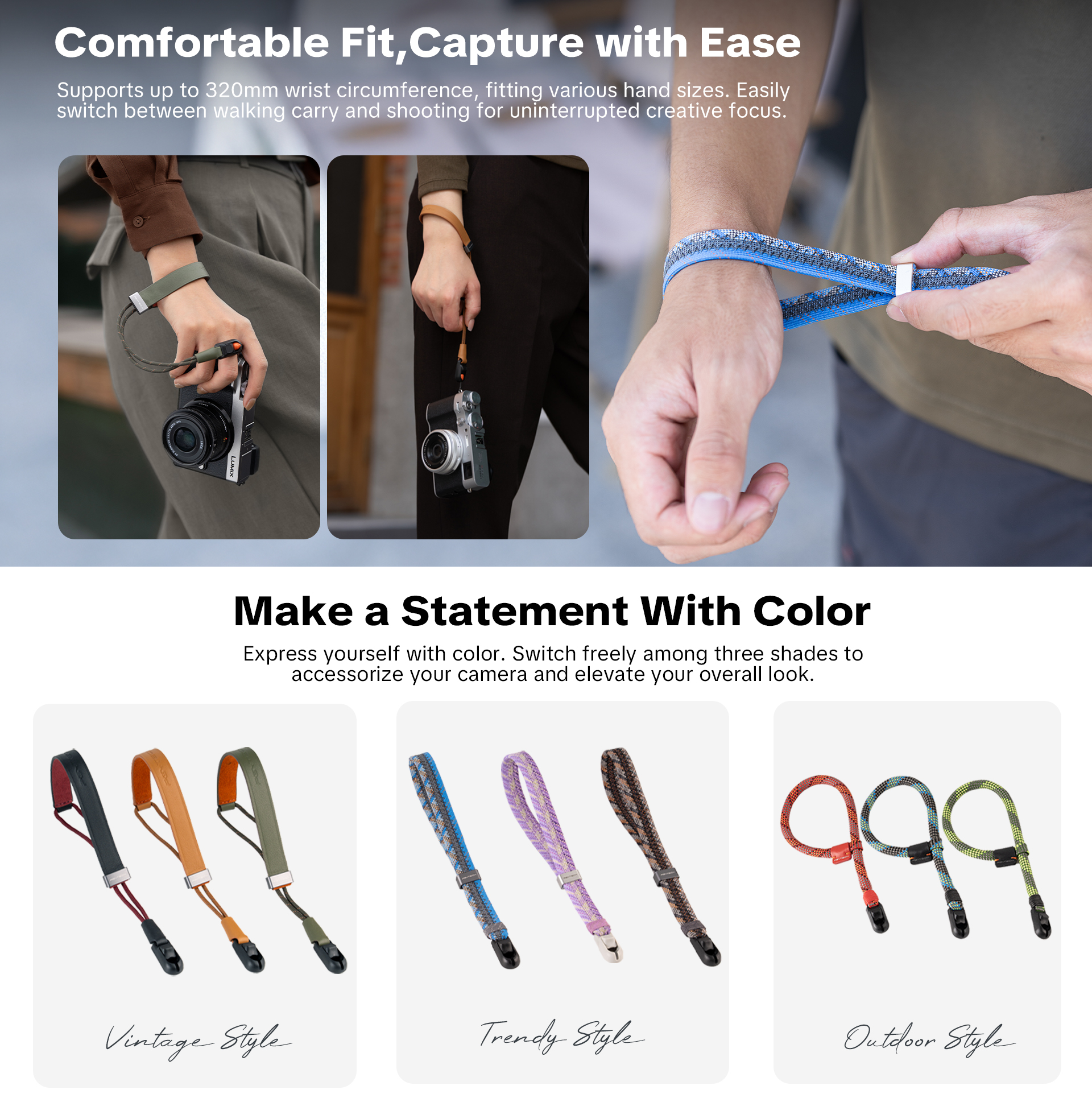 Jeho konštrukcia je navrhnutá tak, aby sa popruh pri zaťažení automaticky zafixoval na zápästí, čím sa zabráni náhodnému pádu fotoaparátu. Nastaviteľný obvod do 320 mm zabezpečuje pohodlné nosenie pre rôzne veľkosti ruky.