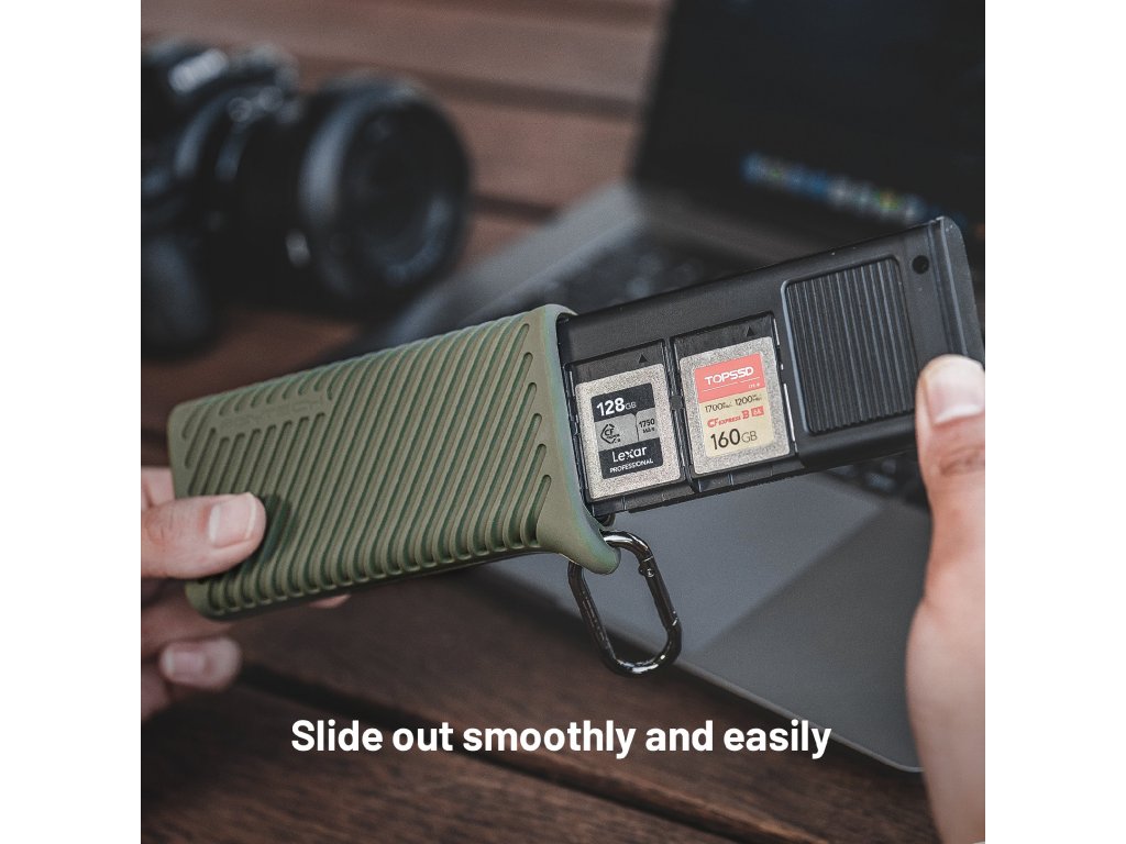 Vysokokapacitné úložisko vo vnútri púzdra: miesto pre 3 kusy CFexpress Type A kariet, 3 SD karty, 4 microSD karty, 2 Nano SIM karty, plus vyťahovací kolíček.