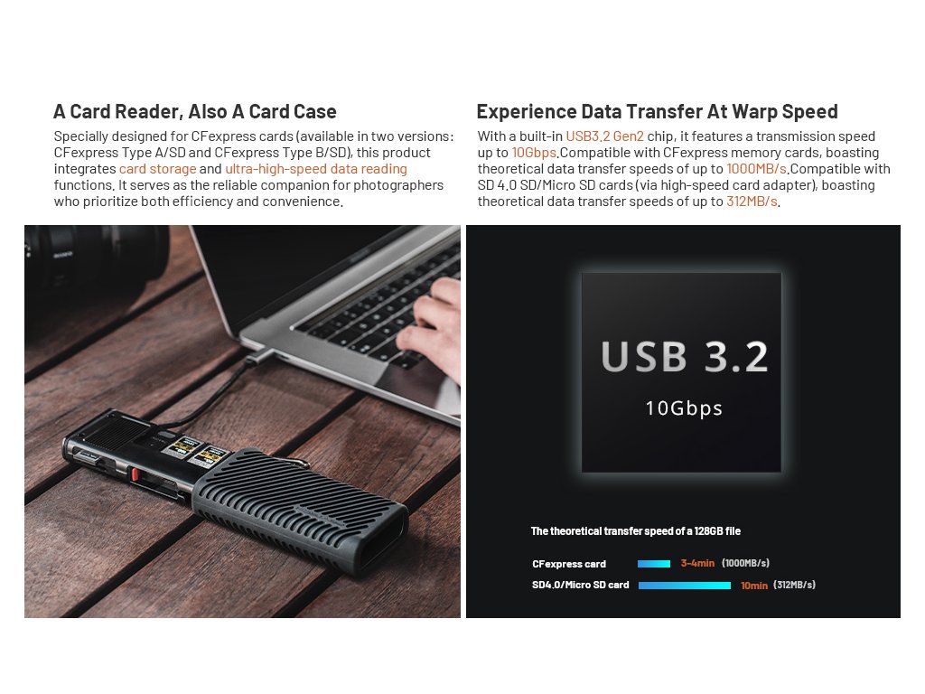 Integrovaná čítačka USB-C 3.2 Gen2 s rýchlosťou prenosu až 10 Gbps, umožňujúca pre CFexpress Type A dosahovať teoretickú rýchlosť do 1000 MB/s, pre SD/microSD karty až do 312 MB/s.