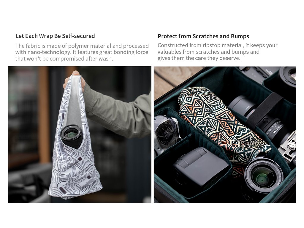 PGYTECH Protective Wrap (Geometry) S je vhodný pre menšie fotoaparáty, objektívy typu 35 mm alebo 50 mm, akčné kamery, filtre, powerbanky, nabíjačky či iné drobné príslušenstvo.