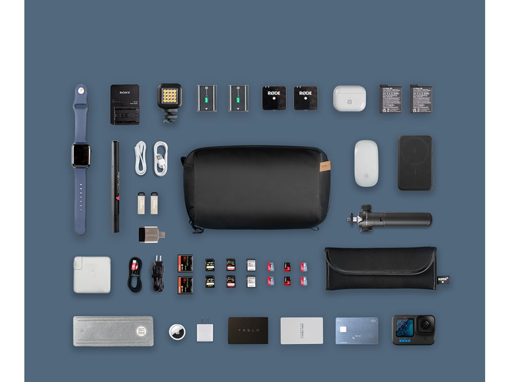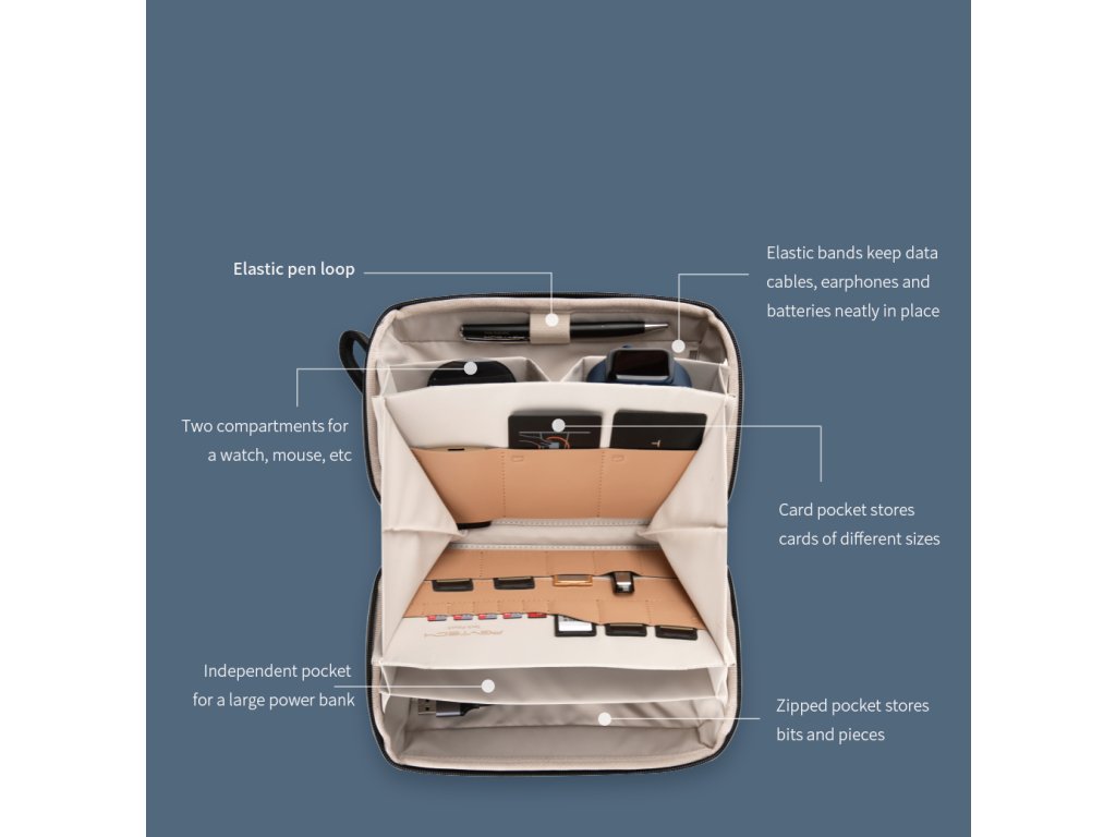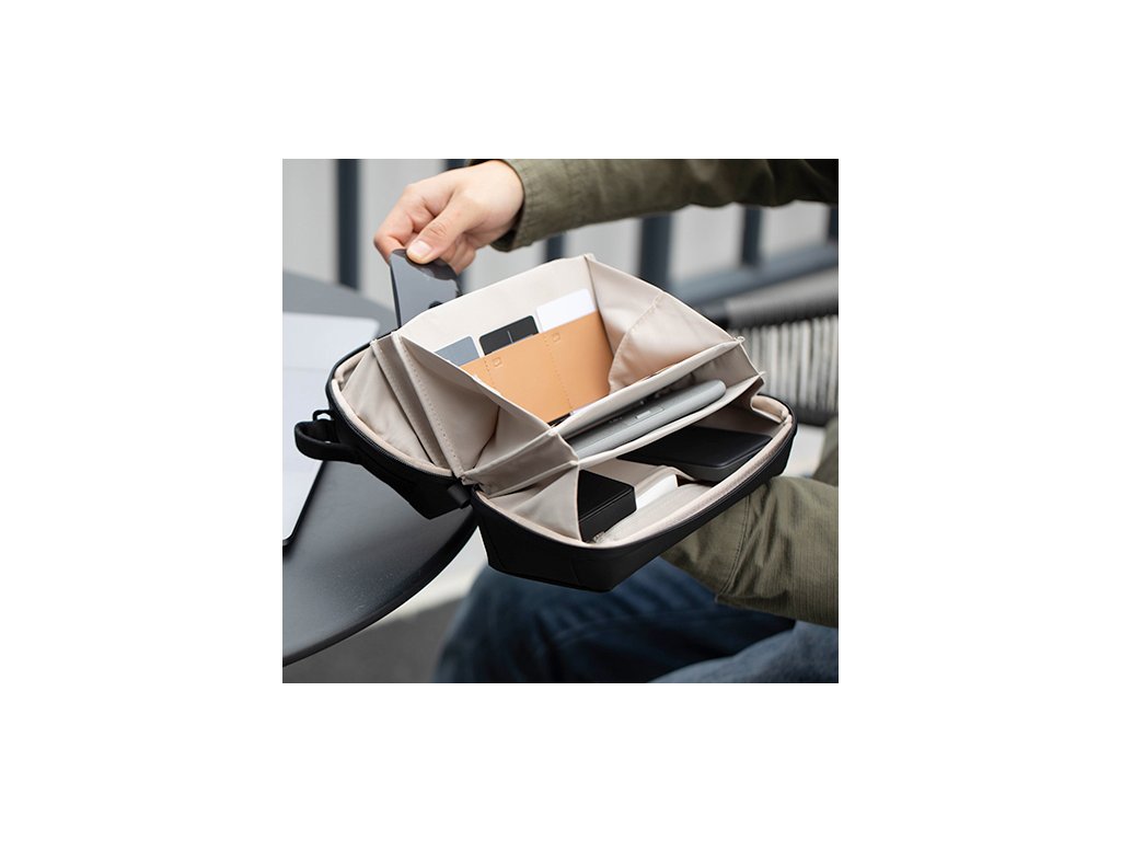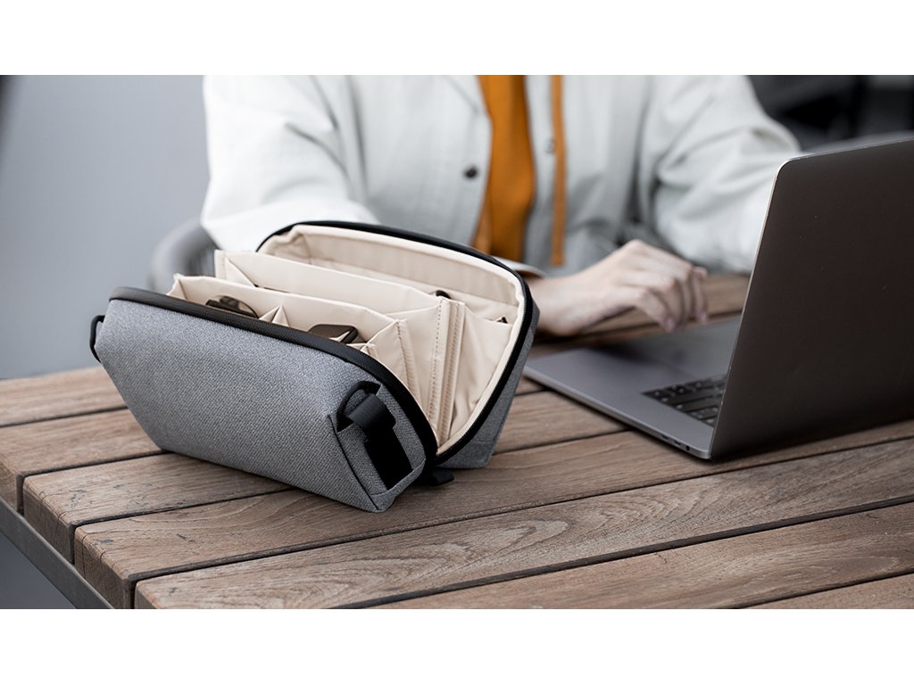 - Tech Organizer má pripevňovacie body, vďaka čomu môže slúžiť ako taška na plece pri použití s popruhom.