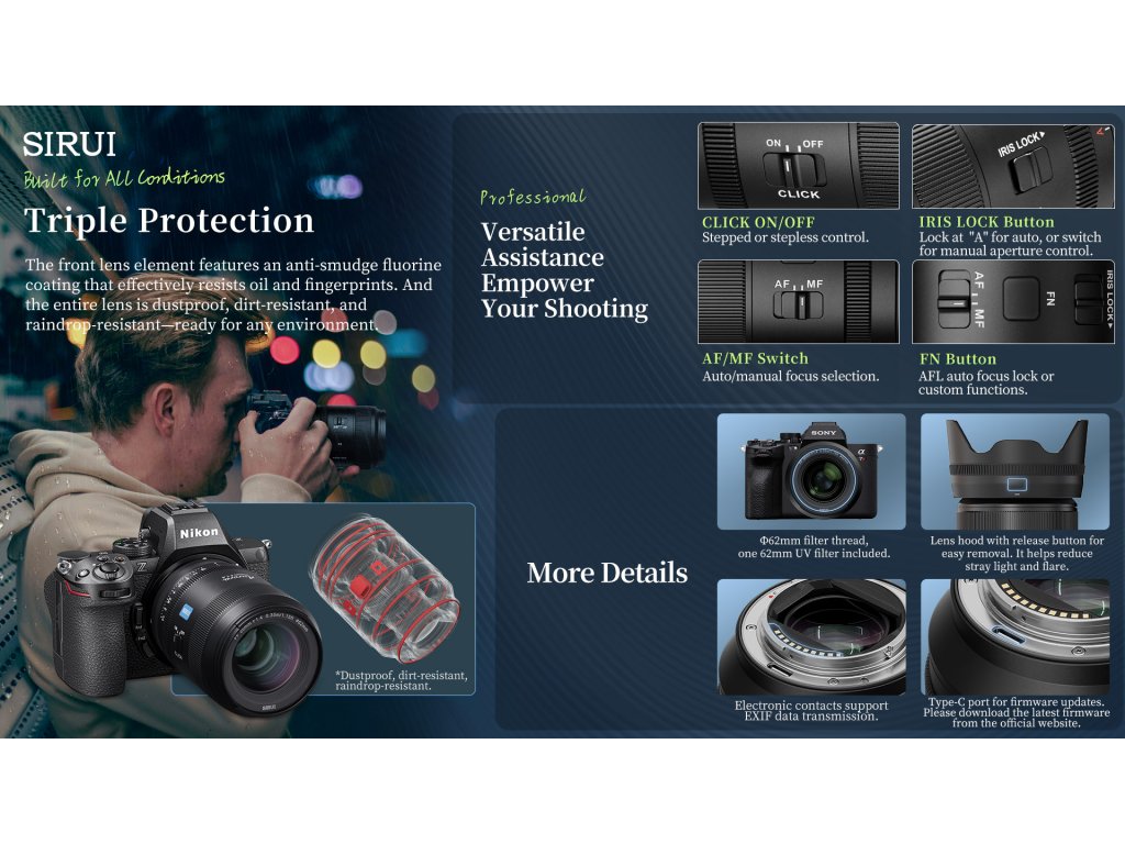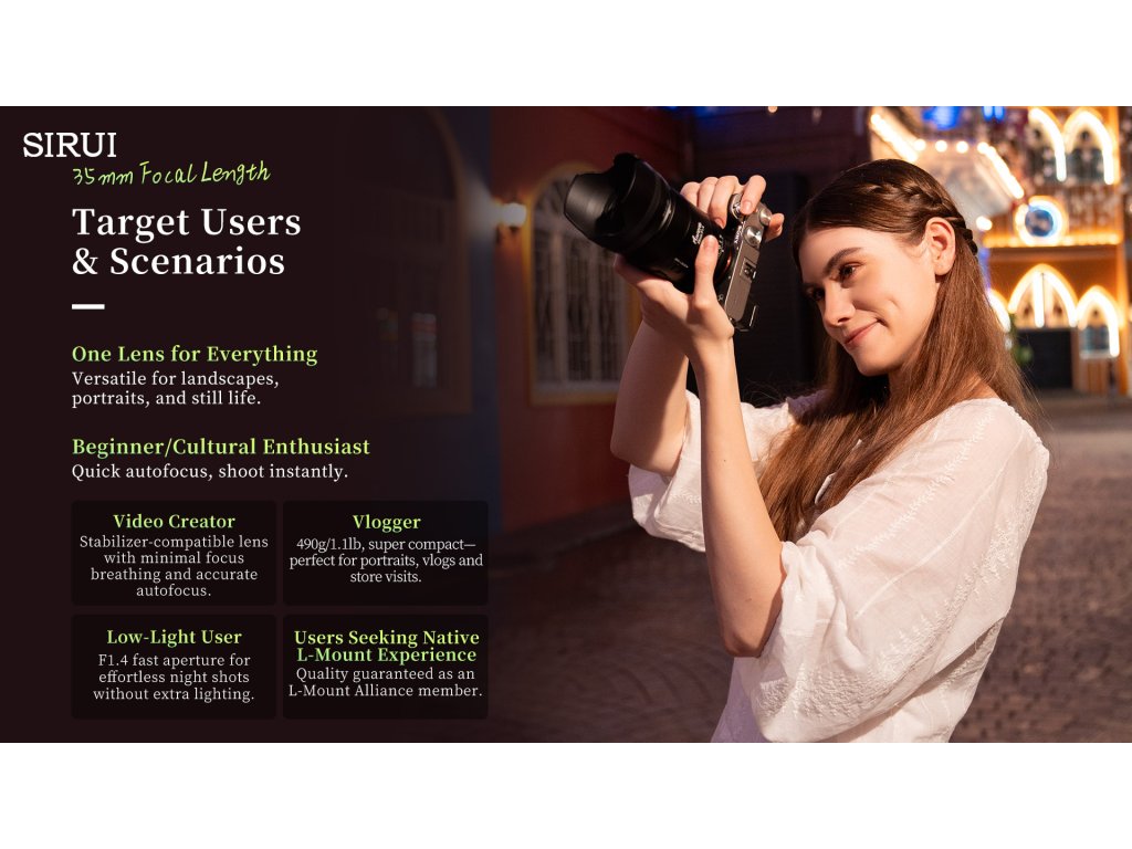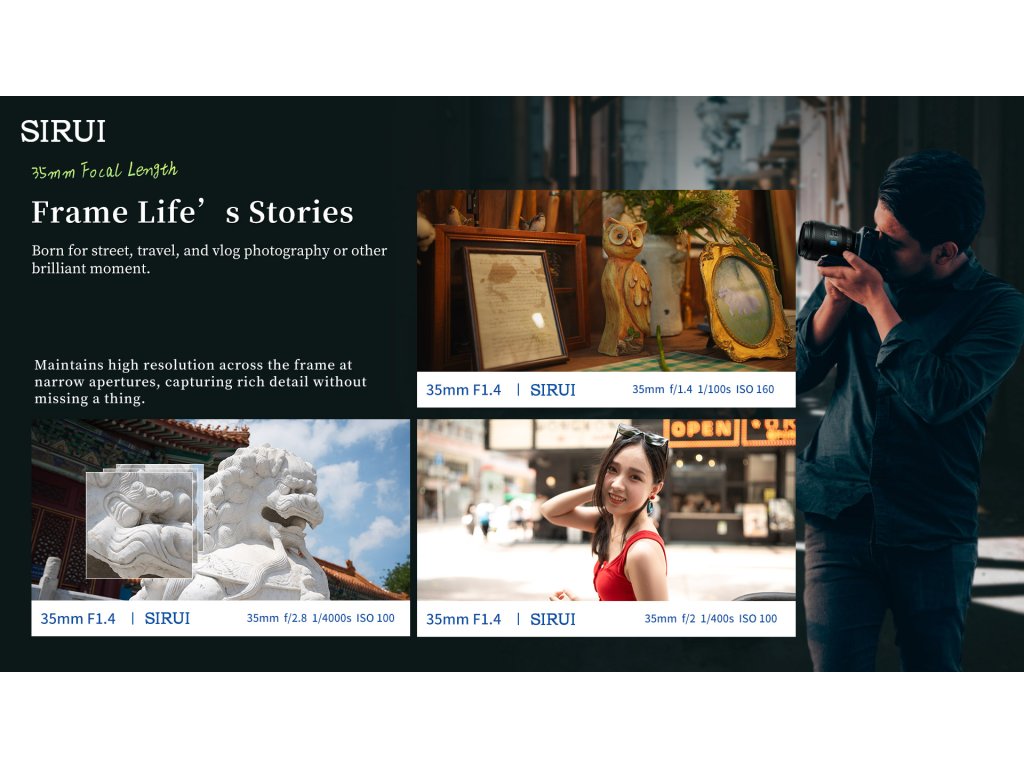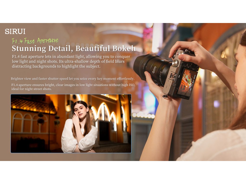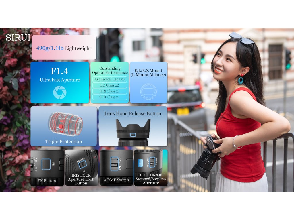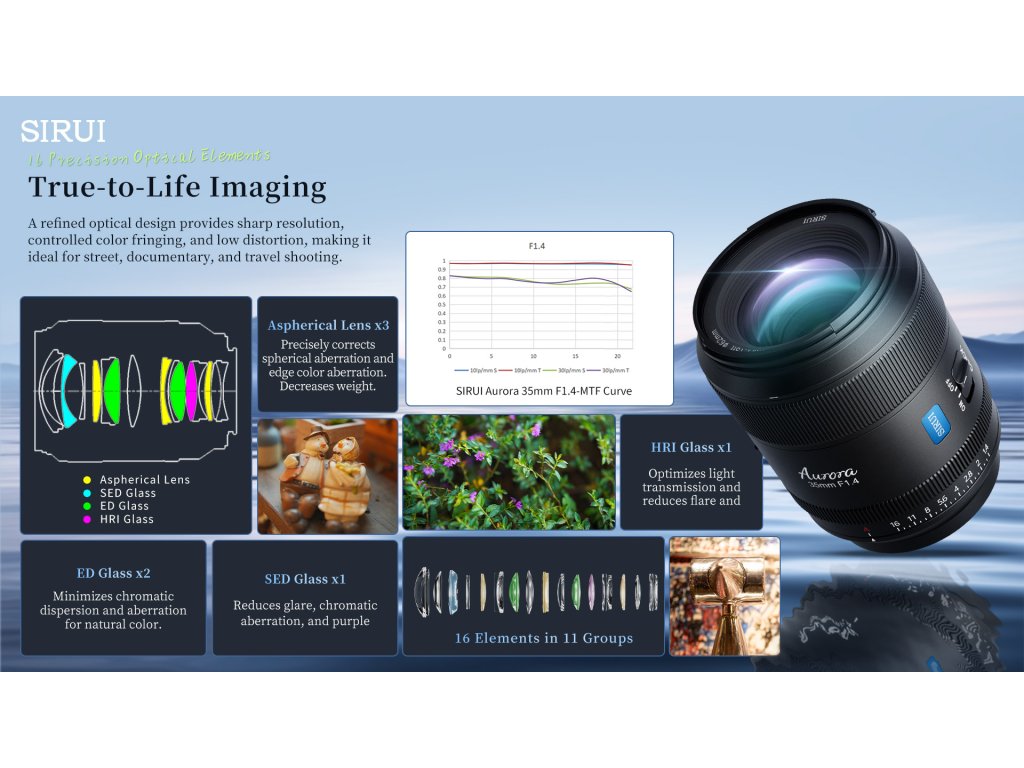 SIRUI AURORA 35mm F1.4 je súčasťou novej série objektívov navrhnutých pre full-frame mirrorless fotoaparáty. Vďaka univerzálnej ohniskovej vzdialenosti 35 mm, vysokej svetelnosti F1.4 a rýchlemu automatickému ostreniu je ideálny pre fotografov aj filmárov, ktorí hľadajú spoľahlivý a kreatívny nástroj v kompaktnom prevedení.