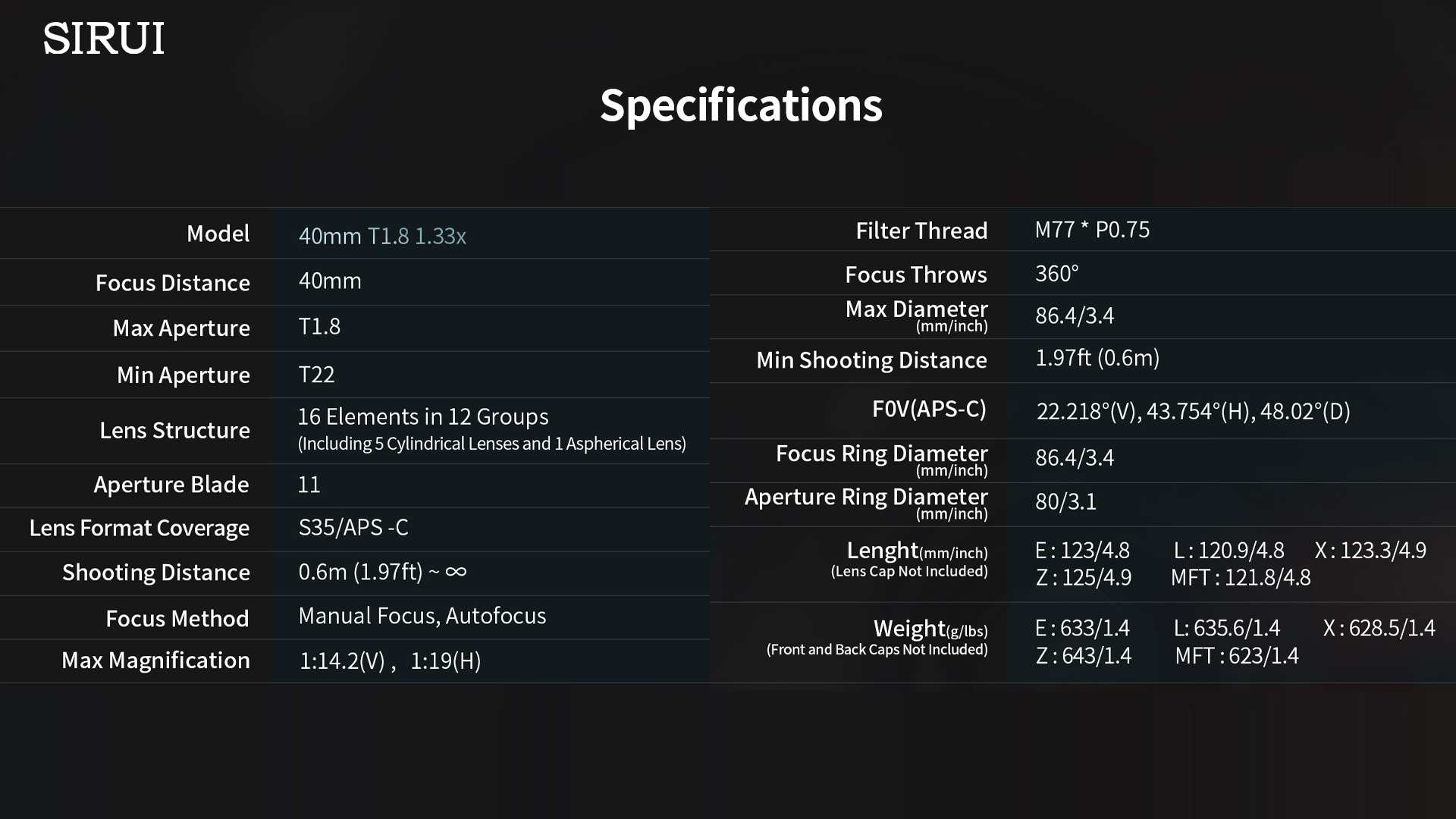 SIRUI 40mm T1.8 1.33X S35 AF Anamorphic Lens