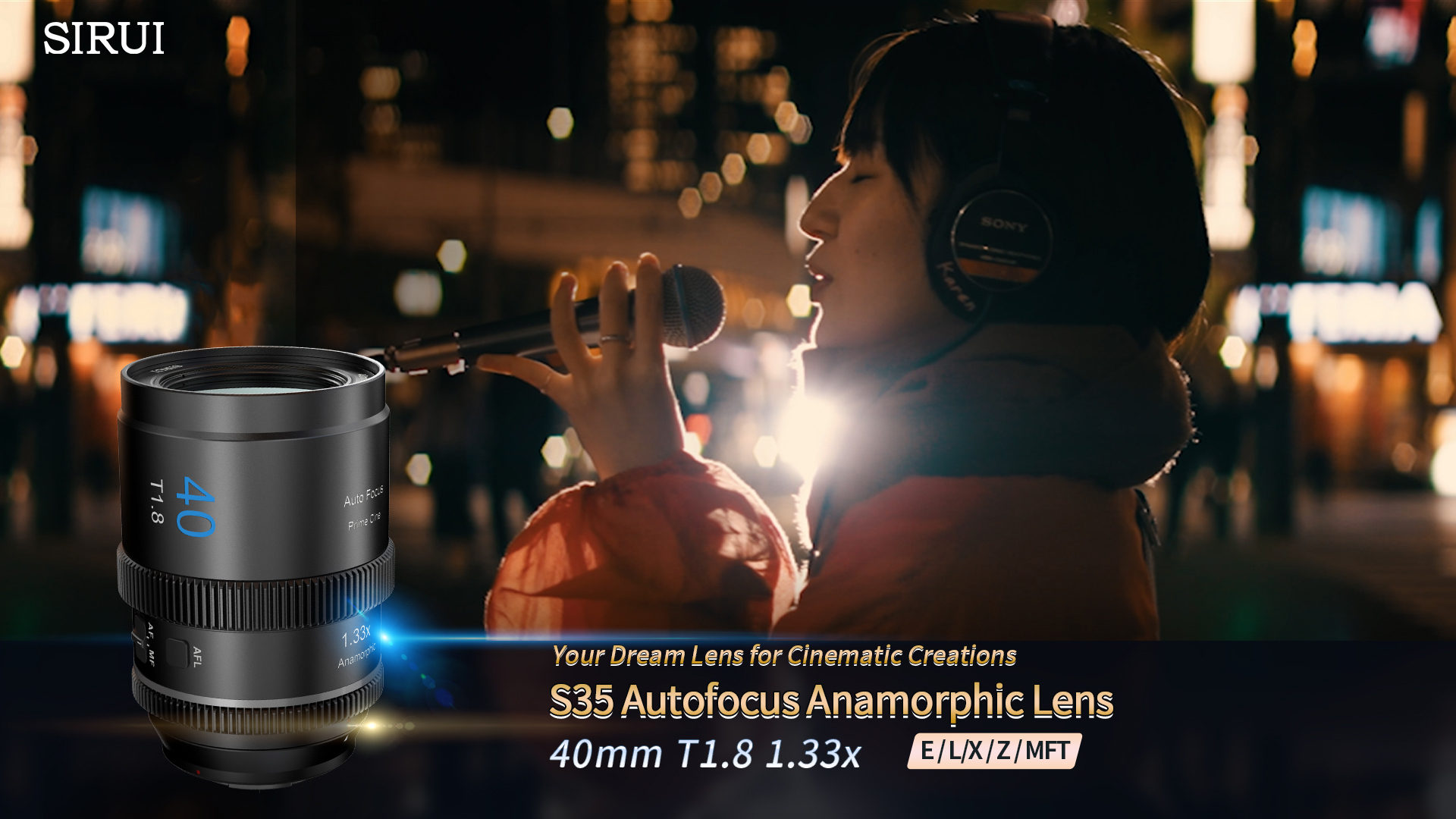 SIRUI 40mm T1.8 1.33X S35 AF je anamorfický objektív navrhnutý pre tvorcov videa, ktorí chcú filmový širokouhlý výstup, charakteristické flare efekty a oválny bokeh, no zároveň aj pohodlie automatického zaostrovania. Objektív používa 1,33× squeeze faktor, pokrýva Super 35 / APS-C snímače a pri zázname v 16:9 vytvára výsledný pomer strán približne 2.35:1.