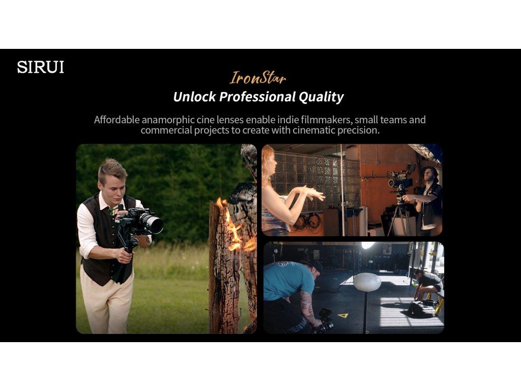 SIRUI IronStar 35mm T1.9 1.5× Anamorphic je profesionálny full-frame filmový objektív navrhnutý pre vysokonáročné produkcie, ktoré vyžadujú dokonalý filmový vzhľad, extrémnu svetelnosť a robustnú konštrukciu. Rad IronStar predstavuje vrchol portfólia značky SIRUI — kombinuje prémiovú optiku, presnú mechaniku a spoľahlivý cine dizajn pre profesionálne kamery s PL alebo EF bajonetom.