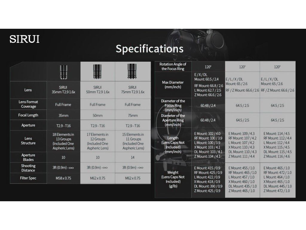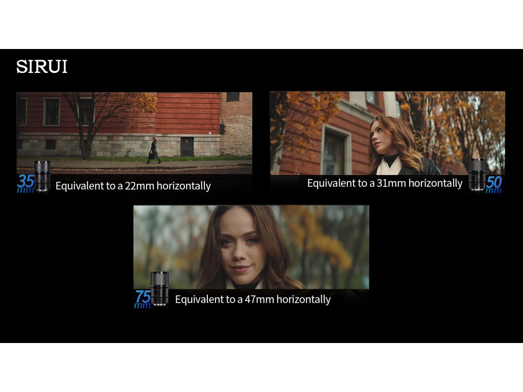 Sada zahŕňa dva objektívy s ohniskovými vzdialenosťami 50 mm a 75 mm, ktoré ponúkajú rovnakú svetelnosť T2.9 a pomer stlačenia 1.6×, čo zaručuje konzistentný filmový vzhľad pri natáčaní. Oba objektívy vytvárajú typické oválne bokehy, horizontálne fláre a široký obraz s pomerom strán 2.8:1 (pri natáčaní v 16:9) alebo 2.4:1 (pri 3:2).