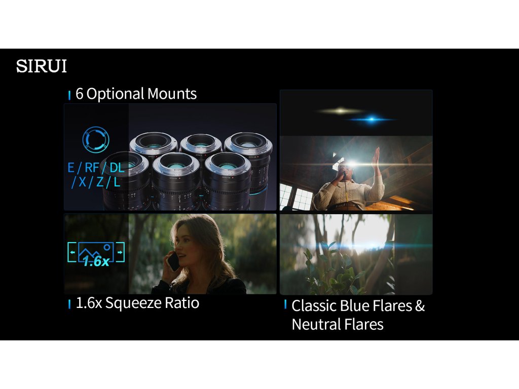 SIRUI Saturn Anamorphic Lens Set je dostupný v bajonetoch Sony E, Canon RF, Nikon Z, L-mount a DJI DL, a vo verziách Blue Flare alebo Neutral Flare, podľa preferovaného vizuálneho štýlu.