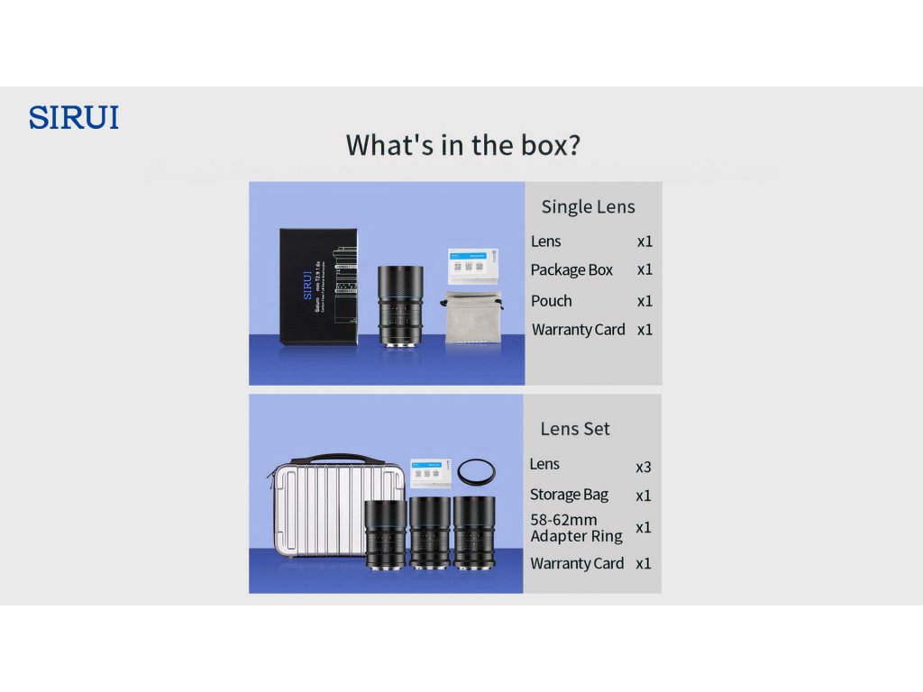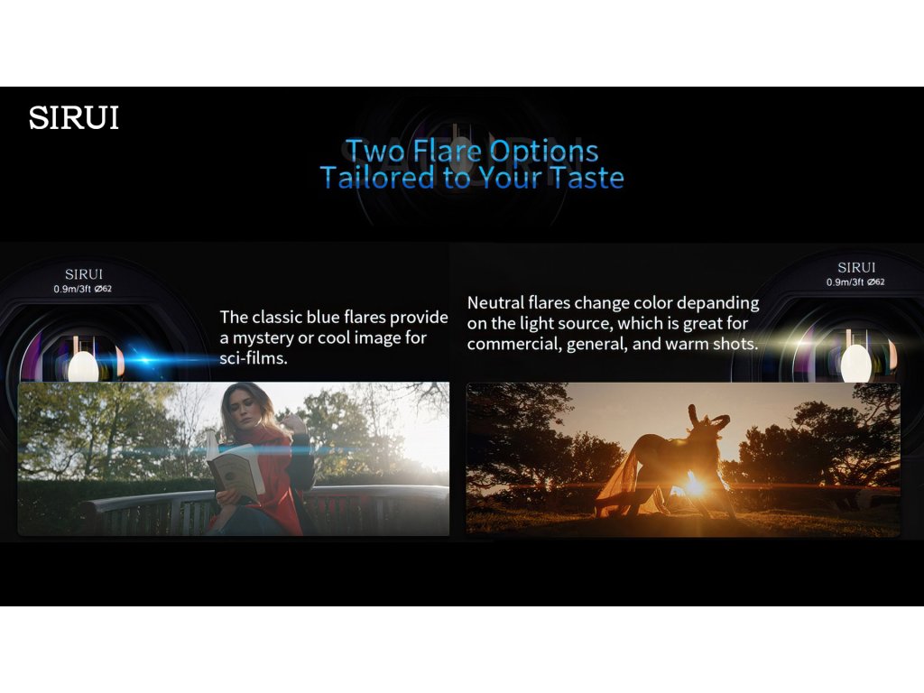 SIRUI Saturn 50mm T2.9 je dostupný v rôznych bajonetoch (Sony E, Canon RF, Nikon Z, L-mount, DJI DL) a vo verziách “Blue Flare” alebo “Neutral Flare” podľa želaného vizuálneho štýlu.
