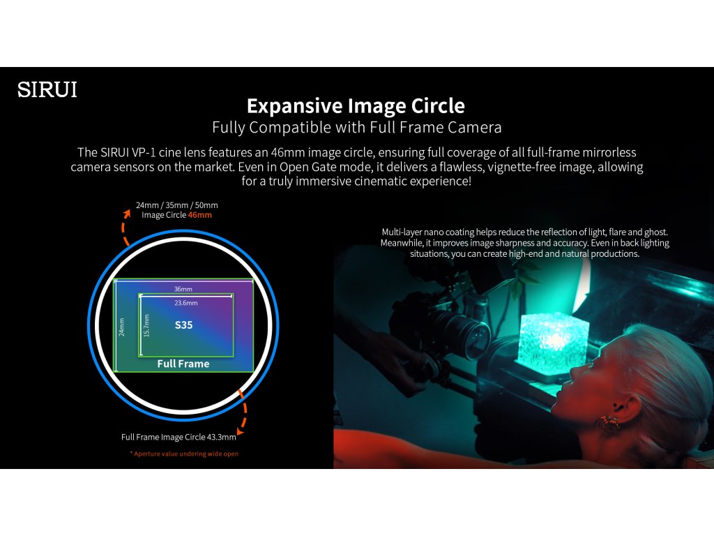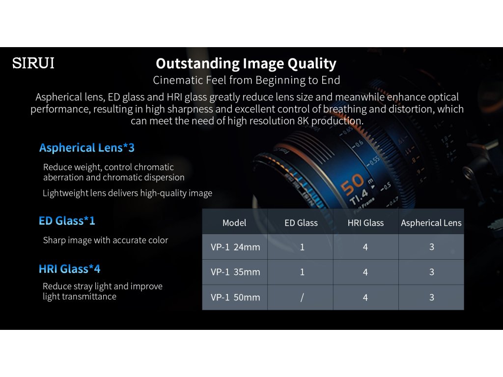 SIRUI Vision Prime 1 Series 50mm T1.4 je profesionálny full-frame cine objektív navrhnutý pre filmárov, ktorí požadujú extrémne svetelnú optiku s precíznym spracovaním a výnimočnou obrazovou kvalitou. Séria Vision 1predstavuje novú generáciu objektívov SIRUI – ponúka vysokú svetelnosť T1.4, výborný mikrokontrast, nádherný bokeh a jednotnú mechaniku naprieč celou sériou.